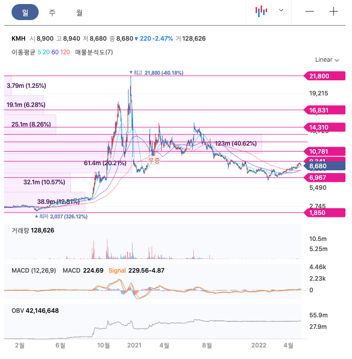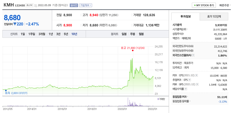 KMH의 주가는 20년 8월 증가하여 20년 12월 최고 21,800원을 찍고 조정을 받았습니다.