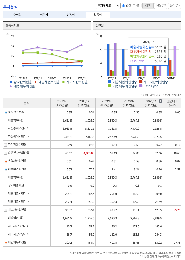 재고자산회전율(높을 수록 좋습니다) : 2019년 약 122억원, 2020년 약 183억원, 2021년 약 284억원이고, 회전율은 2019년 약 28%, 2020년 약 18%, 2021년 약 12%로 안정적입니다.