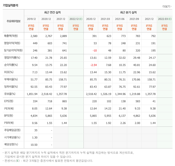 영업이익 : 2018년 346억원, 2019년 449억원, 2020년 603억원, 2021년 741억원으로 전년동기대비 증가하였습니다. 2021년는 전년동기대비 23% 증가하였습니다. 2021년 분기별로 보면 1분기 78억원, 2분기 248억원, 3분기 231억원, 4분기 184억원입니다.