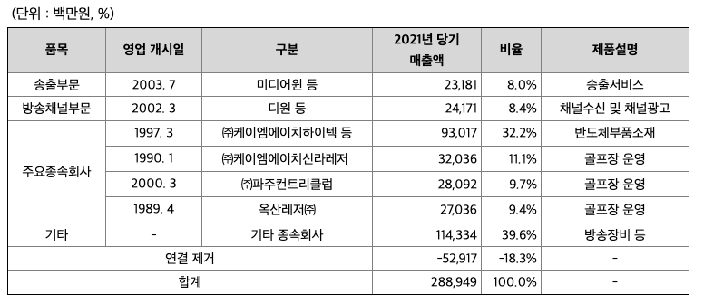 회사는 2000년 10월 PP사업자 등록을 마치고 2002년 제 3세계 영화채널의 개국을 시작으로 PP사업을 시작하였습니다. 이후 2003년 자체장비를 확보, 송출사업을 추가한 후 지속적인 성장을 거듭하여 현재 국내 송출사업자 1위 지위를 유지하고 있으며, 현재에 이르고 있습니다. 이후 2016년 부터 반도체재료 제조업 ㈜케이엠에이치하이텍 및 골프장 운영업 ㈜케이엠에이치신라레저, ㈜파주컨트리클럽, 옥산레저㈜(위탁운영) 등을 종속회사로 하여 지배회사로서 사업을 확대해 나가고 있습니다.