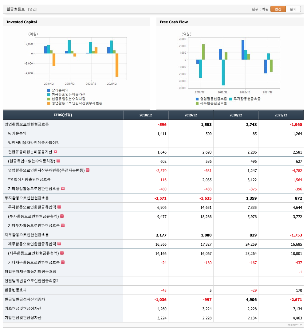 투자활동 현금흐름 : 2018년 -2571억원, 2019년 -3635억원, 2020년 1359억원, 2021년 872억원으로 2018년과 2019년의 투자활동 현금흐름이 원활합니다.