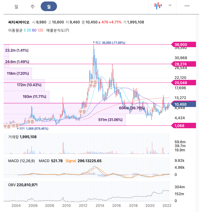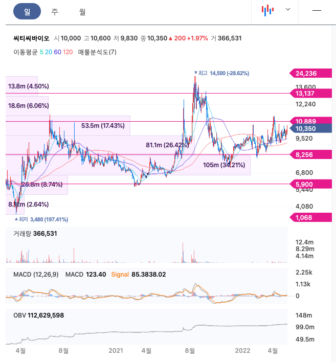 씨티씨바이오의 주가는 21년 6월 증가하여 21년 8월 최고 14,500원을 찍고 조정을 받았습니다.