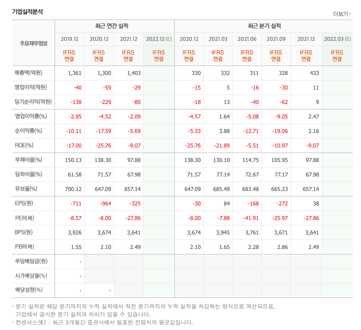 영업이익 : 2018년 -59억원, 2019년 -40억원, 2020년 -59억원, 2021년 -29억원으로 전년동기대비 적자지속하였습니다. 2021년 분기별로 보면 1분기 5억원, 2분기 -16억원, 3분기 -30억원, 4분기 11억원입니다.