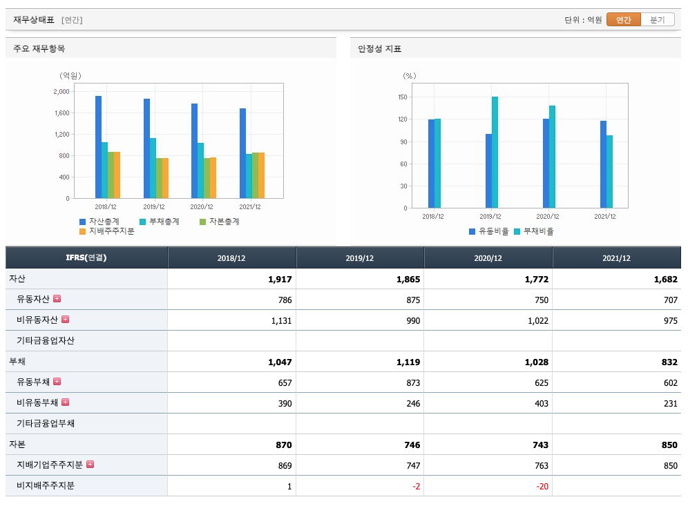 투자활동 현금흐름 : 2018년 -82억원, 2019년 103억원, 2020년 16억원, 2021년 22억원으로 2018년의 투자활동 현금흐름이 원활합니다.