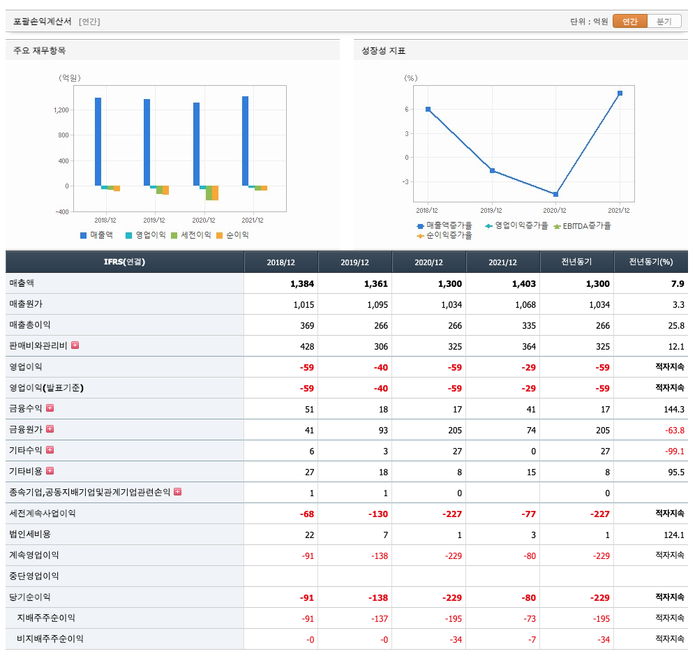 매출액 : 2018년 1384억원, 2019년 1361억원, 2020년 1300억원, 2021년 1403억원으로 전년동기대비 증가하였습니다. 2021년는 전년동기대비 7.9% 증가하였습니다. 2021년 분기별로 보면 1분기 332억원, 2분기 311억원, 3분기 328억원, 4분기 433억원입니다.