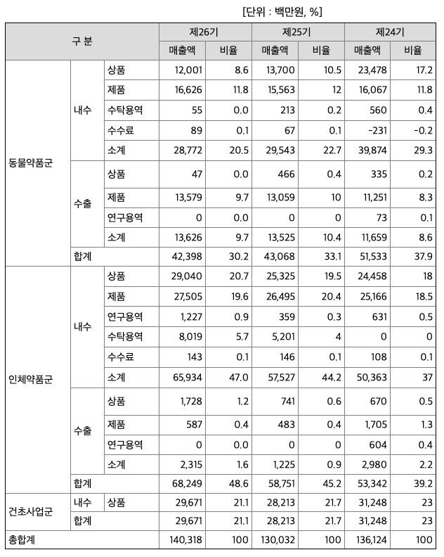 당사는 제26기 연결기준 140,317백만원(동물약품 72,069백만원, 인체약품 68,249백만원)의 매출을 기록하였습니다. 당사에서 판매하고 있는 상제품은 수백종에 달하기 때문에 특정제품에 매출 비중이 집중되지 않고 고르게 판매되고 있습니다. 이에 따라 원재료의 종류 또한 수백종에 달하며 매입처 또한 특정되지 않습니다. 수입의 경우 환율에 따라 매입단가가 변동되기 때문에 원재료가격 변동 추이를 산출하기가 어렵습니다.