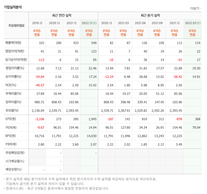 CAPEX(Capital expenditures,자본적 지출,미래의 이윤을 창출하기 위해 지출한 비용을 말함) : 2019년 12억원, 2020년 22억원, 2021년 80억원으로 CAPEX가 좋습니다. 2022년은 20억원으로 추정됩니다.