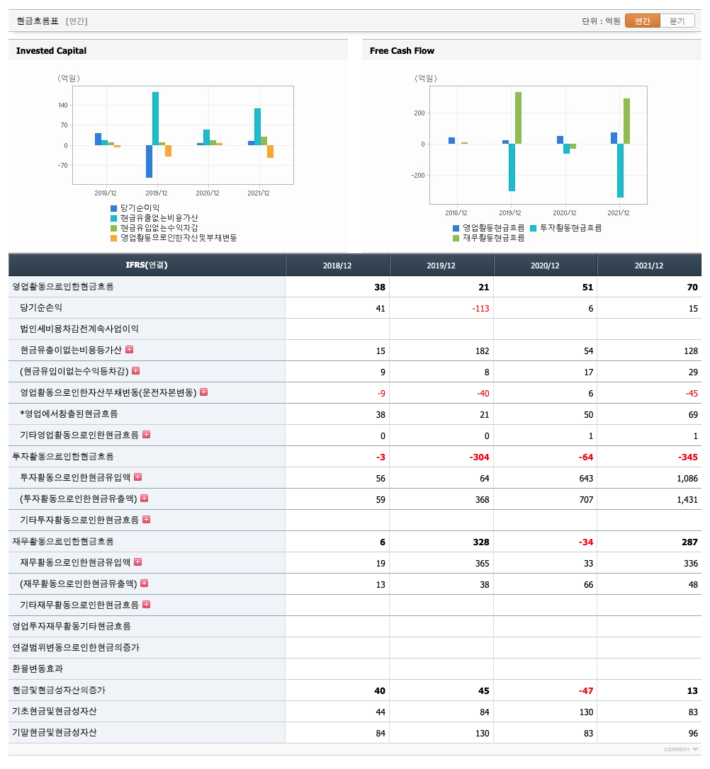 영업활동 현금흐름 : 2018년 38억원, 2019년 21억원, 2020년 51억원, 2021년 70억원으로 영업활동 현금흐름이 원활합니다.