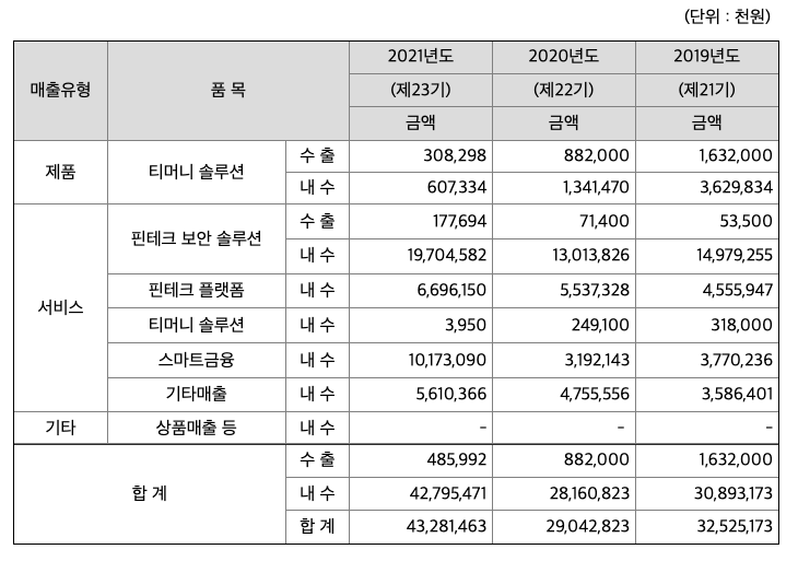 매출액 : 2018년 280억원, 2019년 325억원, 2020년 290억원, 2021년 433억원으로 전년동기대비 증가하였습니다. 2021년는 전년동기대비 49% 증가하였습니다. 2021년 분기별로 보면 1분기 87억원, 2분기 126억원, 3분기 109억원, 4분기 112억원입니다.