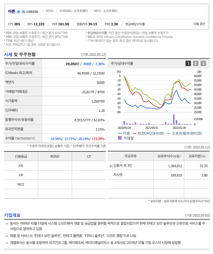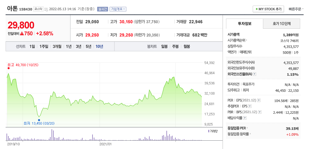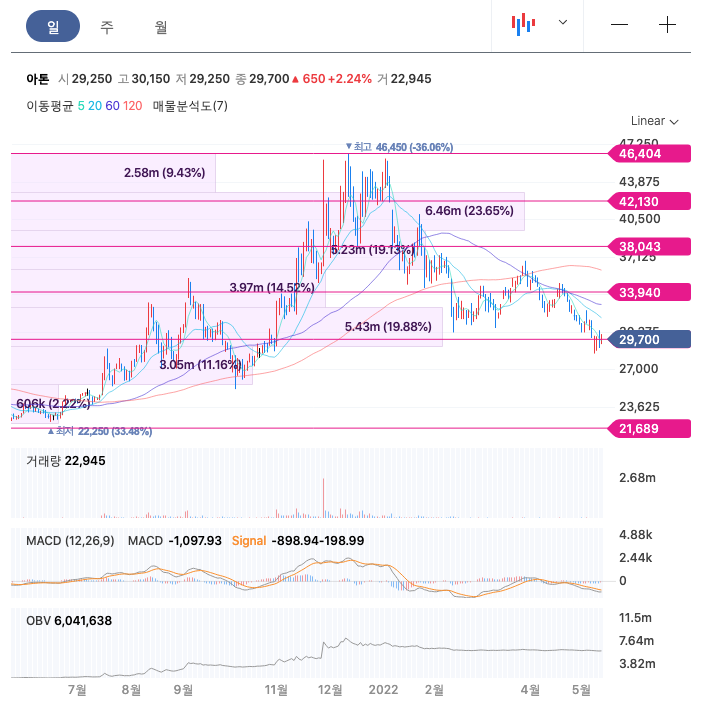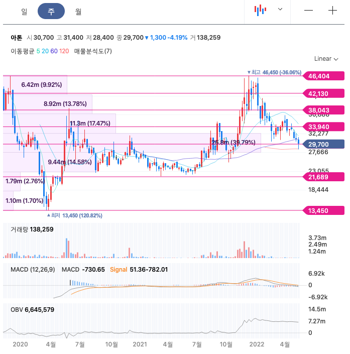 아톤의 주가는 21년 6월 증가하여 21년 12월 최고 46,450원을 찍고 조정을 받았습니다.