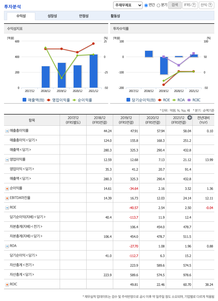 영업이익 : 2018년 35억원, 2019년 41억원, 2020년 21억원, 2021년 91억원으로 전년동기대비 증가하였습니다. 2021년는 전년동기대비 341.5% 증가하였습니다. 2021년 분기별로 보면 1분기 7억원, 2분기 40억원, 3분기 19억원, 4분기 26억원입니다.