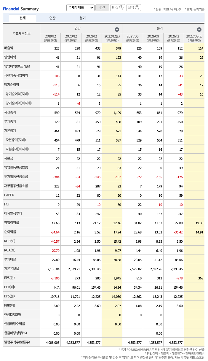 FCF(미래현금흐름) : 2019년 9억원, 2020년 29억원, 2021년 -10억원으로 CAPEX가 좋습니다. 2022년은 80억원으로 추정됩니다.