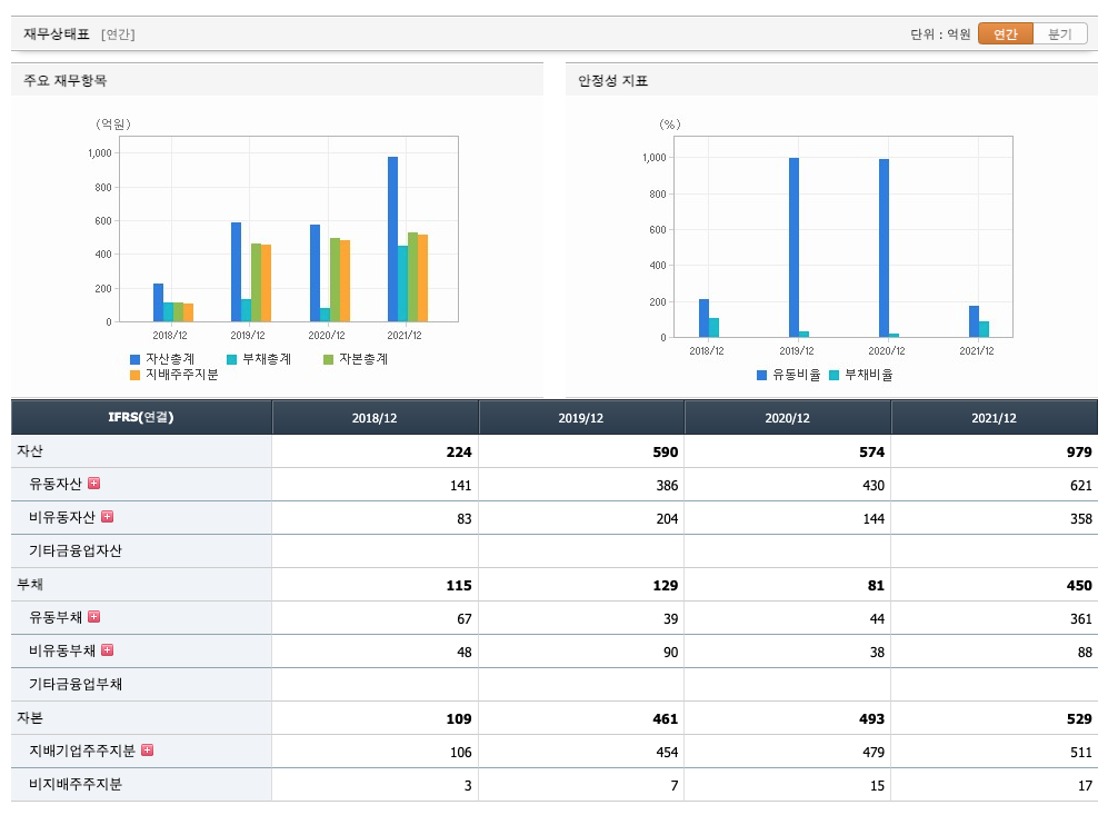 자산은 2018년 224억원, 2019년 590억원, 2020년 574억원, 2021년 979억원으로 증가하였습니다.