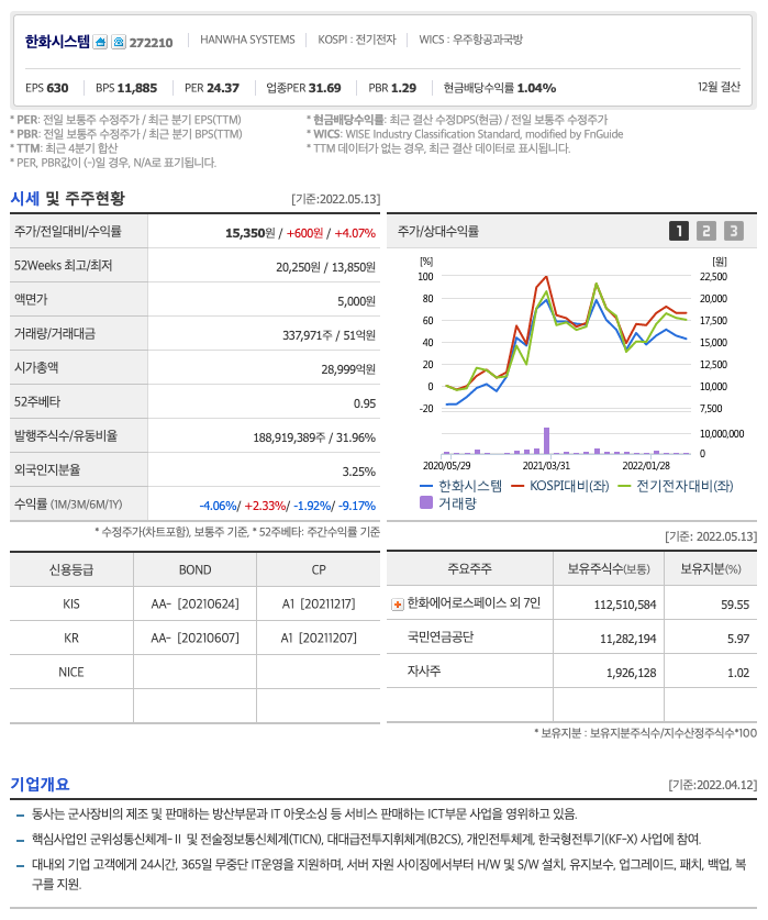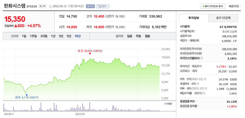 | 한화시스템 | 15,350원 | 15,916원 | 15,968원 | 15,886원 |