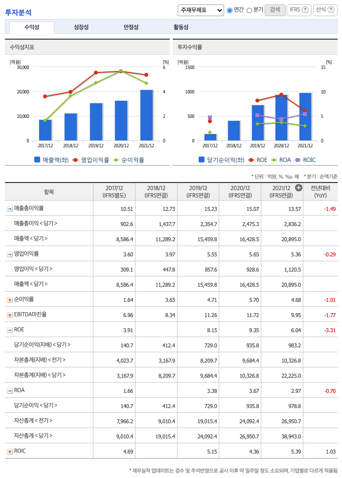 ROA(Return On Assets, 총자산순이익율, 경영자의 관점) : 2017년 약 1%, 2019년 약 3%, 2020년 약 3%, 2021년 약 2%이고, 자기자본순이익율은 이상율(10%)보다 낮습니다.
