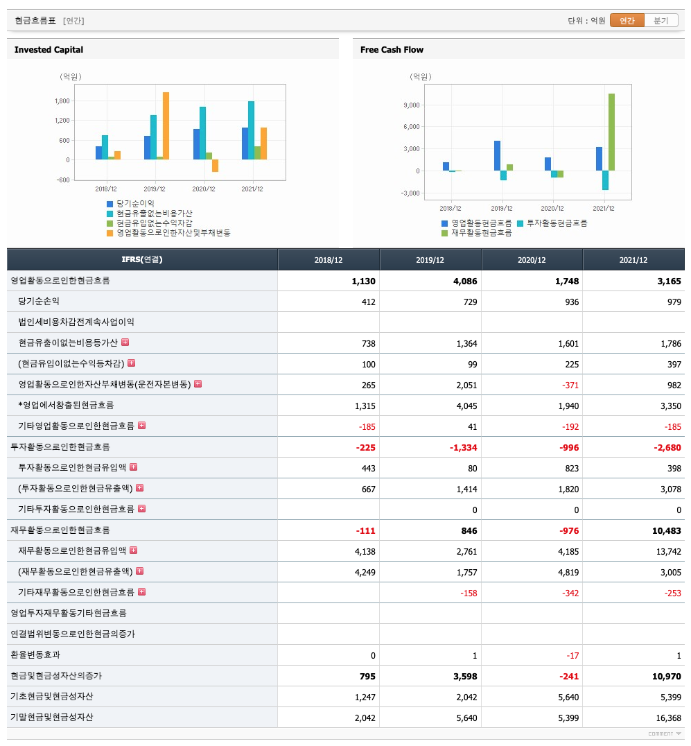 투자활동 현금흐름 : 2018년 -225억원, 2019년 -1334억원, 2020년 -996억원, 2021년 -2680억원으로 투자활동 현금흐름이 원활합니다.