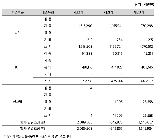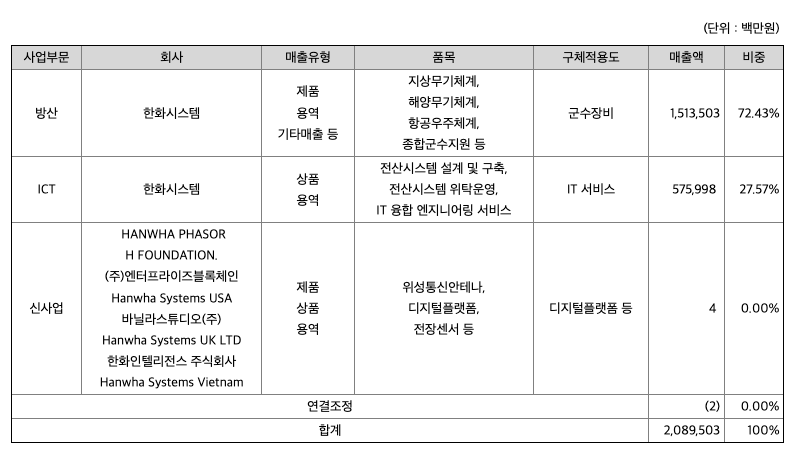 당사 및 당사의 종속회사는 방산전자 분야의 핵심기술을 바탕으로 제품의 개발, 생산 및 판매를 주요 사업으로 하는 방산부문과 기업의 전산 시스템을 구축(SI), 유지보수(ITO) 등 서비스를 판매하는 ICT 부문이 있으며, 신사업으로 에어모빌리티(Air Mobility), 위성통신사업과 블록체인기술 기반의 디지털 플랫폼이 있습니다.