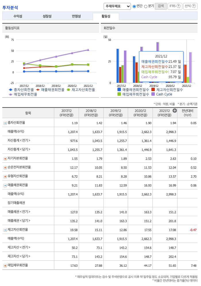 재고자산회전율(높을 수록 좋습니다) : 2019년 약 154억원, 2020년 약 148억원, 2021년 약 202억원이고, 회전율은 2019년 약 12%, 2020년 약 17%, 2021년 약 17%로 안정적입니다.