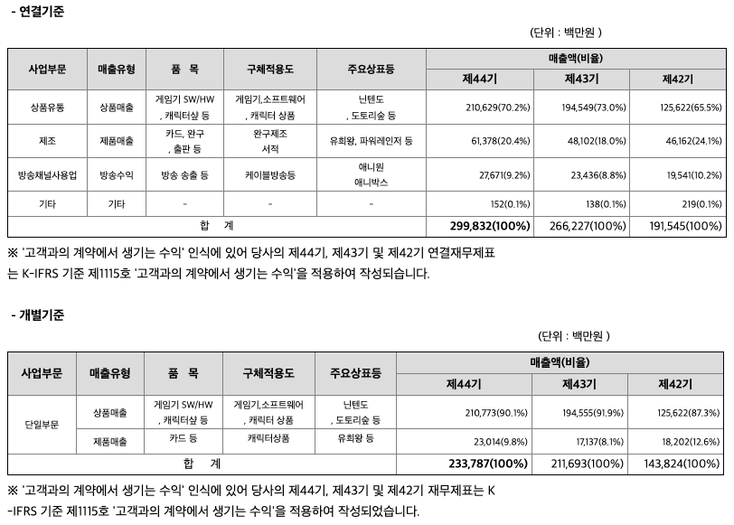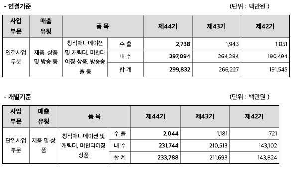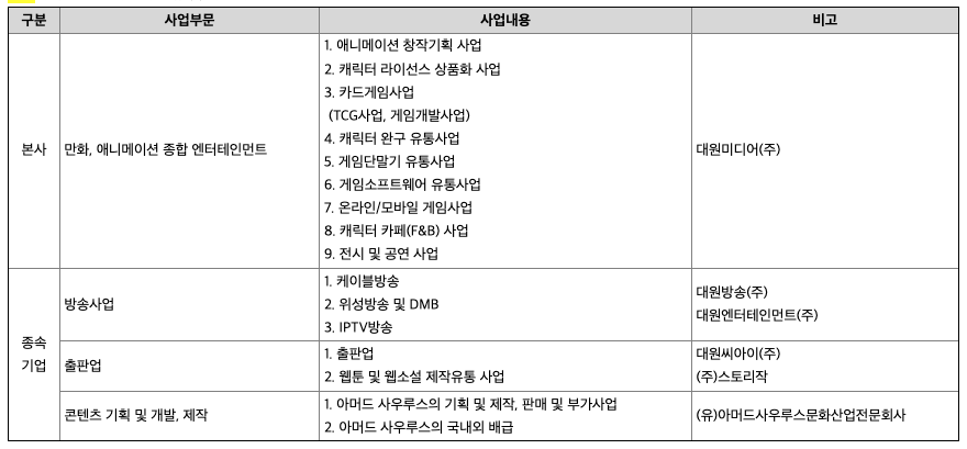 당사는 당사외에 종속회사 및 관계회사를 통해 만화 및 애니메이션 콘텐츠와 관련한 종합 엔터테인먼트 사업을 영위하고 있습니다. 당사는 현재 애니메이션 창작기획 사업, 콘텐츠 사업, 캐릭터 사업, 트레이딩 카드게임 사업, 게임유통사업, 영화ㆍ전시이벤트 사업 및 완구유통사업 등을 영위하고 있으며 종속회사 및 관계회사를 통해 방송사업, 만화 출판사업 및 웹툰/웹소설 제작ㆍ유통사업을 전개하고 있습니다.