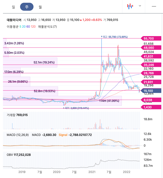 대원미디어의 주가는 21년 3월 반등하여 21년 4월 최고 55,700원을 찍고 조정을 받았습니다.