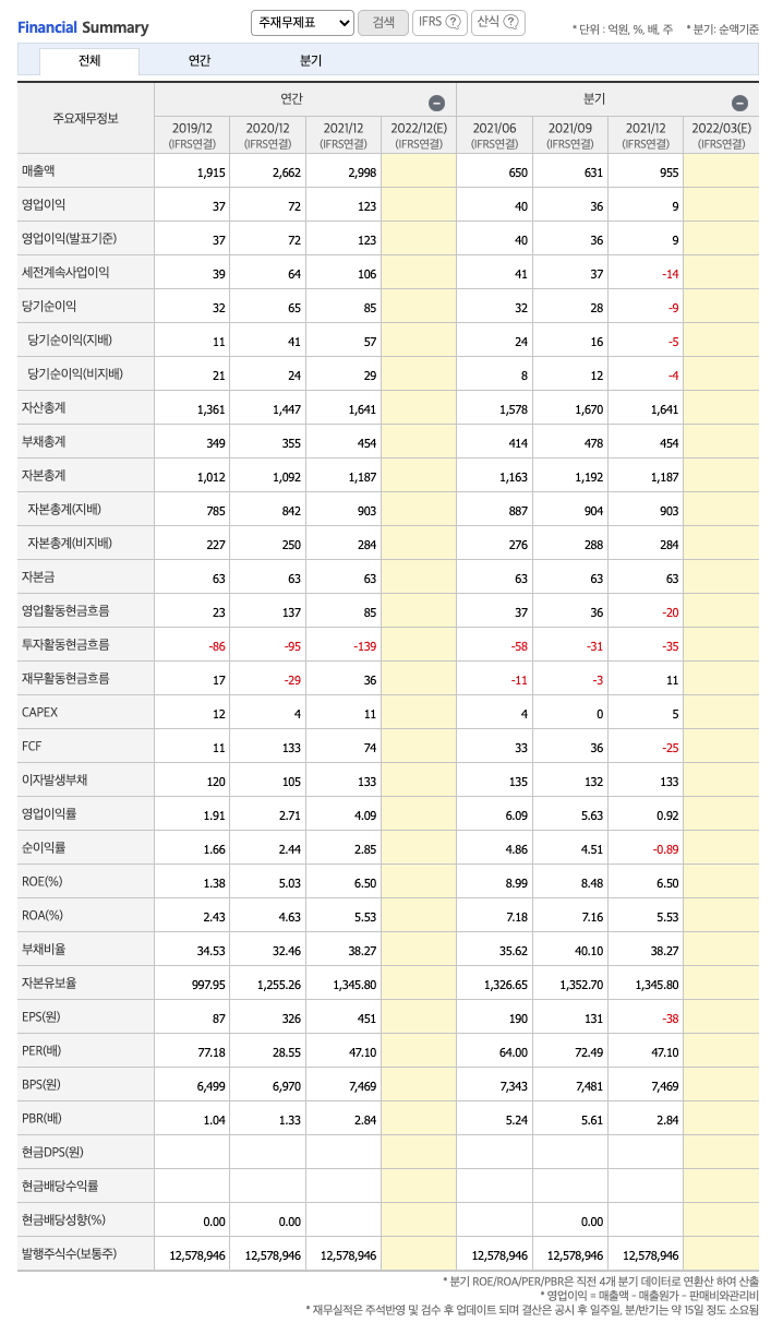 매출액 : 2018년 1634억원, 2019년 1915억원, 2020년 2662억원, 2021년 2998억원으로 전년동기대비 증가하였습니다. 2021년는 전년동기대비 12.6% 증가하였습니다. 2021년 분기별로 보면 1분기 762억원, 2분기 650억원, 3분기 631억원, 4분기 955억원입니다.