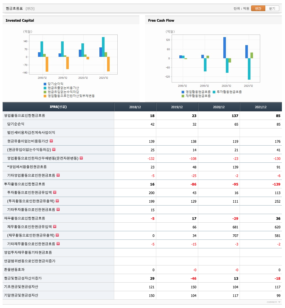 투자활동 현금흐름 : 2018년 16억원, 2019년 -86억원, 2020년 -95억원, 2021년 -139억원으로 2019년이후 투자활동 현금흐름이 원활합니다.