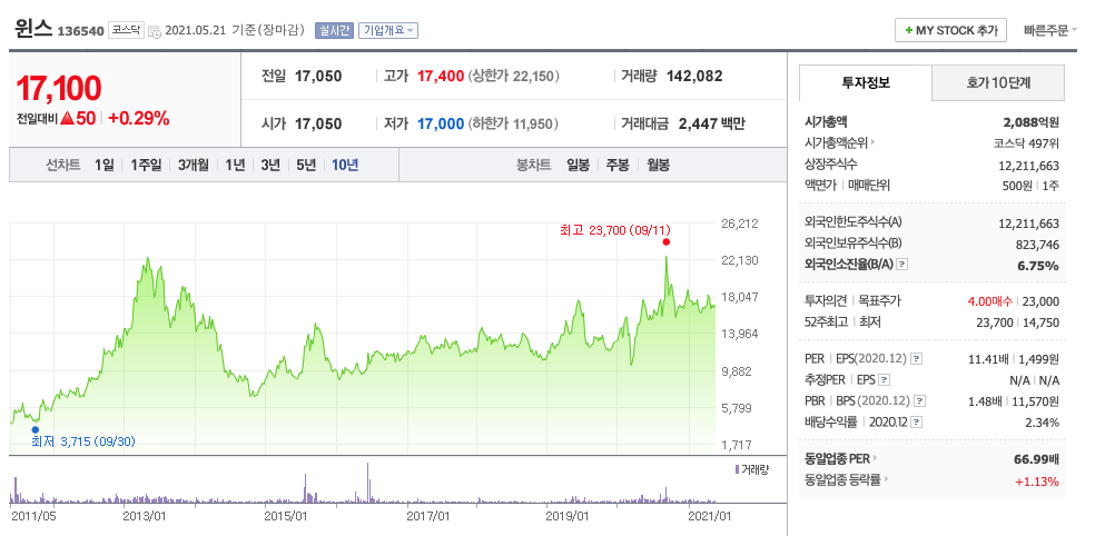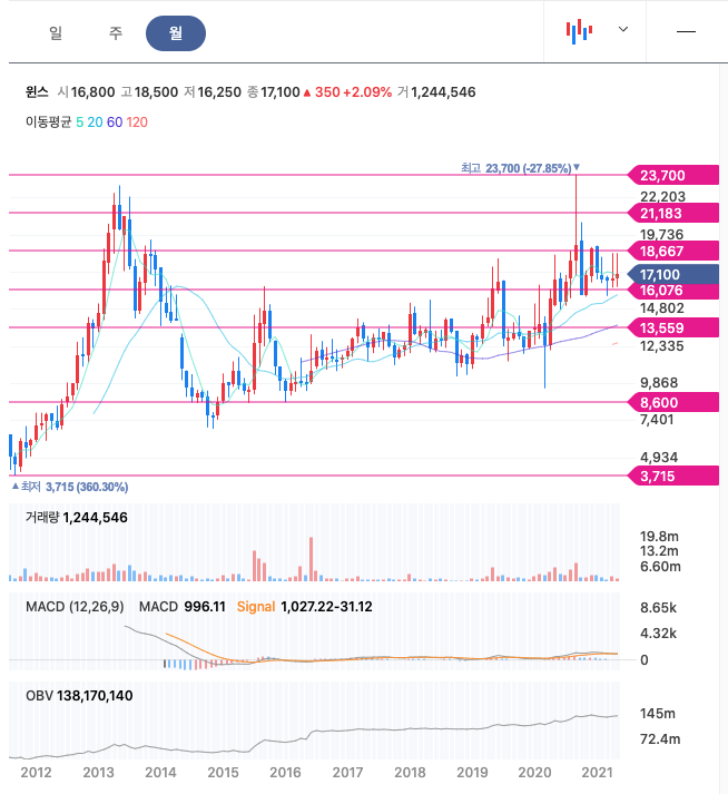 윈스는 20년 9월에 급등하여 최고점 23,700원을 찍고 조정을 받았으며, 보합중에 있습니다.