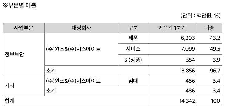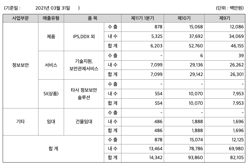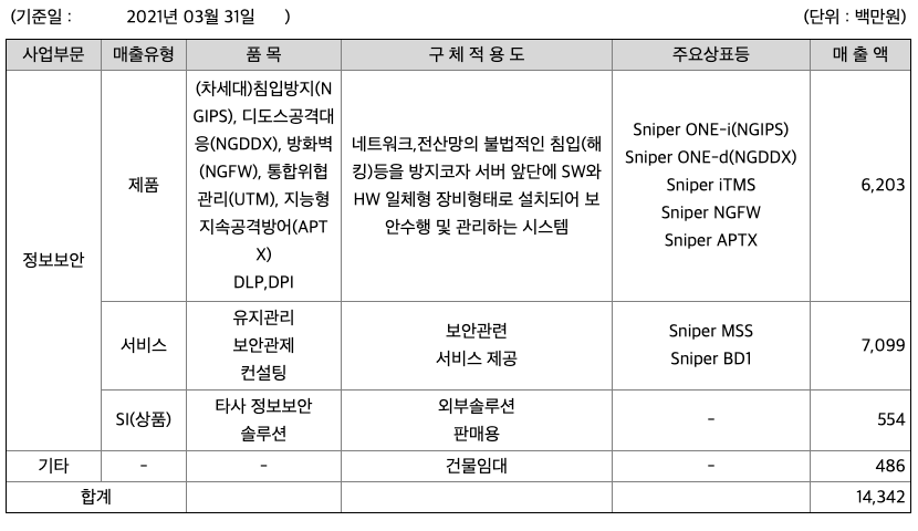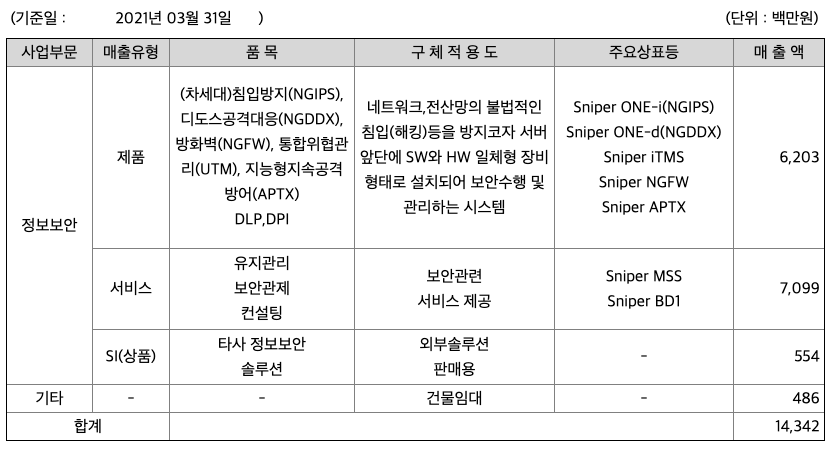 당사는 정보보안사업 내 네트워크보안분야에서 차세대 침입방지시스템(ONE-i), DDoS차단시스템(ONE-d)을 주력으로, 차세대방화벽(NGFW), 랜섬웨어 등 APT공격대응솔루션(APTX), 통합위협관리(TMS)에 이르기까지 시장 이슈에 따른 핵심 솔루션에서 각각 우위를 기록하며 보안기술과 시장을 선도하고 있으며, 종속회사인 (주)시스메이트는 당사의 네트워크보안 제품의 핵심 하드웨어인 네트워크인터페이스카드(NIC) 제조 및 공급을 포함해, 트래픽 제어솔루션인 DPI솔루션과 내부정보유출방지시스템(DLP)를 제조 및 공급하고 있습니다.