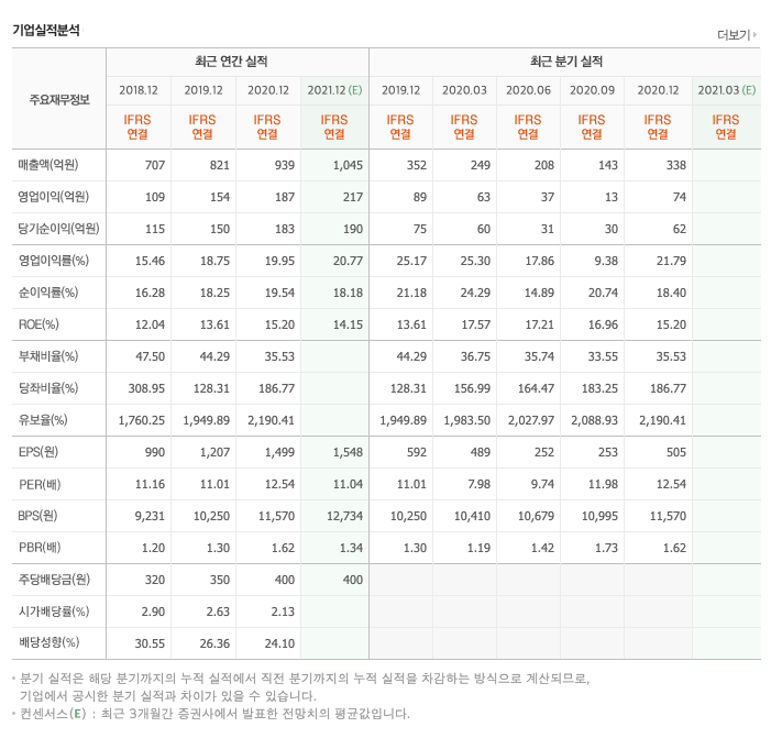 2021년 기대되는 적정주가(ROE x EPS) = 14.15x 1548원으로, 적정주가의 가격은 21900원으로 평가됩니다.