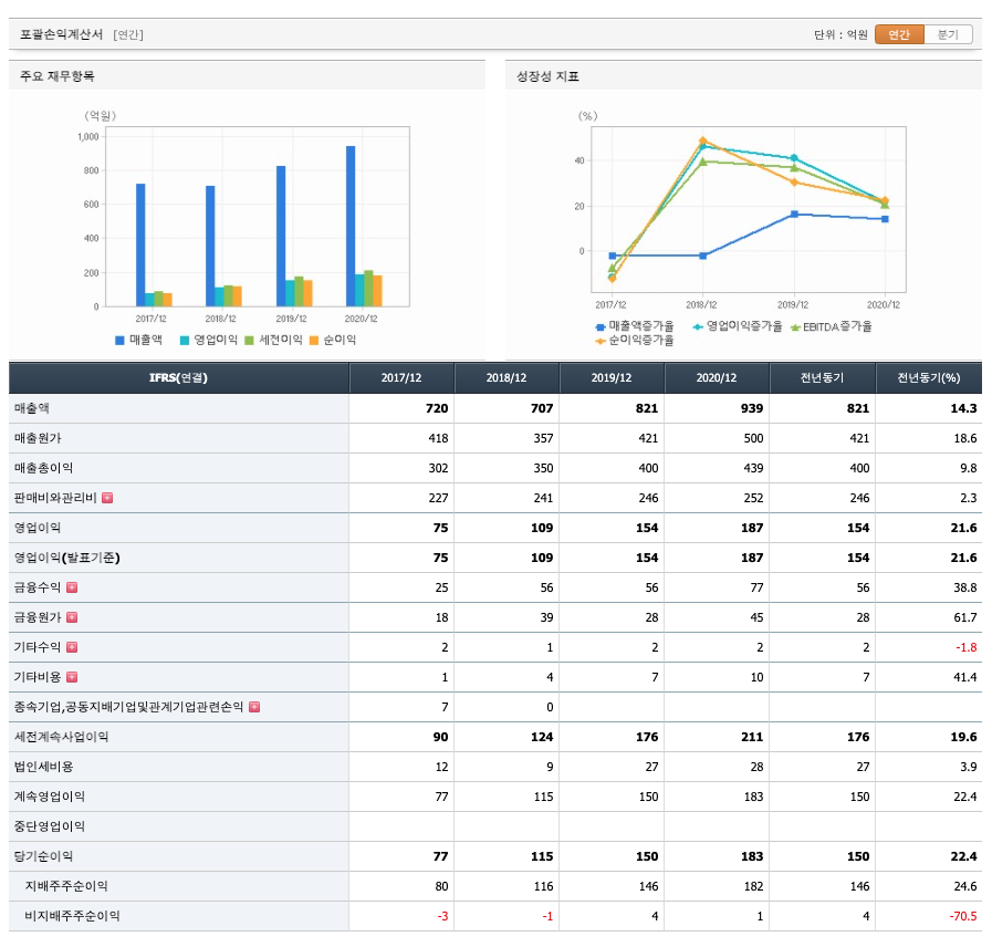 매출액 : 2017년 720억원, 2018년 707억원으로 감사하였고, 2019년 821억원, 2020년 939억원으로 증가하였습니다. 2020년은 전년동기대비 14.3% 증가하였습니다. 2020년 분기별로 보면 1분기 249억원, 2분기 208억원, 3분기 143억원, 4분기 338억원입니다.
