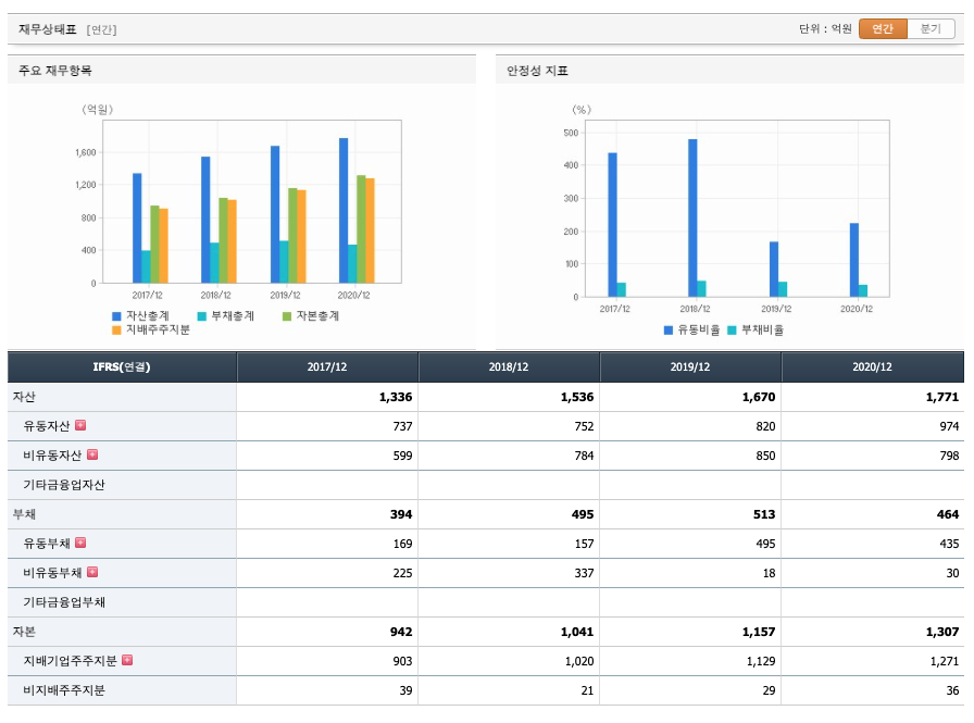 유보율 : 2018년 약 1760%, 2019년 약 1949%, 2020년 약 2190%로 증가하고 있고, 유보율이 높아 사내 유동자산이 좋습니다.
