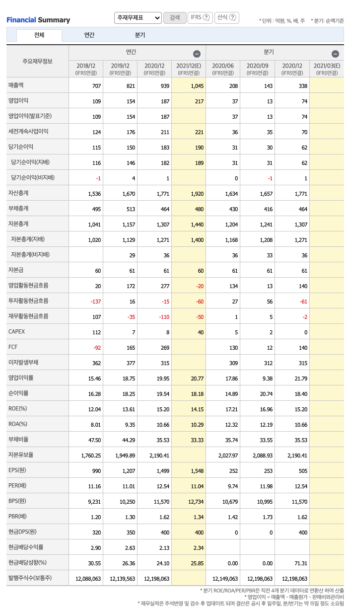 CAPEX(Capital expenditures,자본적 지출,미래의 이윤을 창출하기 위해 지출한 비용을 말함) : 2018년 112억원, 2019년 7억원, 2020년 8억원으로 CAPEX가 좋습니다. 2021년은 40억원으로 추정됩니다.