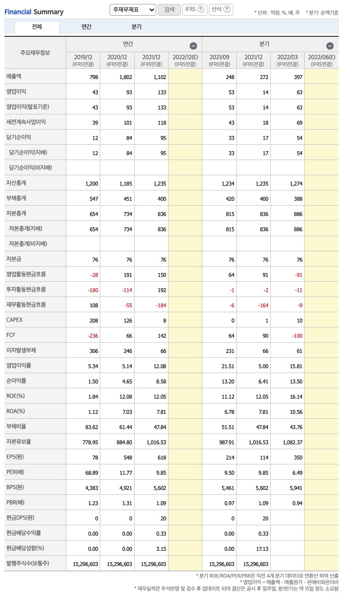당사의 2021년 연결기준 매출액은 1,102억원, 영업이익은 133억원, 당기순이익은 94억원으로 전년 동기간 대비 매출액은 700억(39%) 감소하였으나, 영업이익은 40억 및 당기순이익은 11억 증가하였습니다.