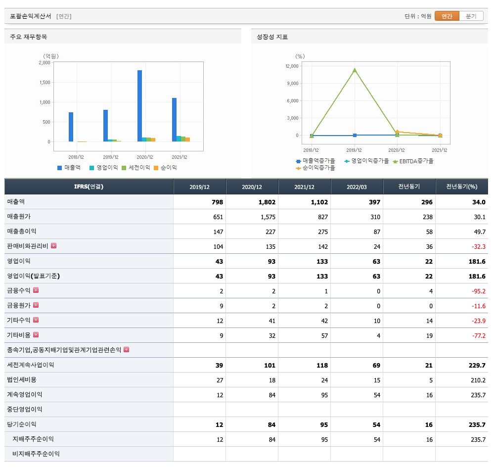 매출액 : 2018년 798억원, 2019년 1802억원, 2020년 1102억원, 2021년 397억원으로 전년동기대비 증가하였습니다. 2021년는 전년동기대비 34% 증가하였습니다. 2021년 분기별로 보면 1분기 286억원, 2분기 248억원, 3분기 272억원, 4분기 397억원입니다.