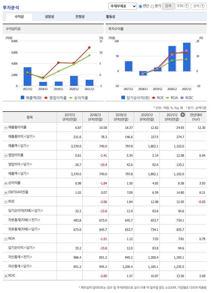 ROA(Return On Assets, 총자산순이익율, 경영자의 관점) : 2018년 약 -1.51%, 2019년 약 1.12%, 2020년 약 7%, 2021년 약 7%이고, 자기자본순이익율은 이상율(10%)보다 낮습니다.