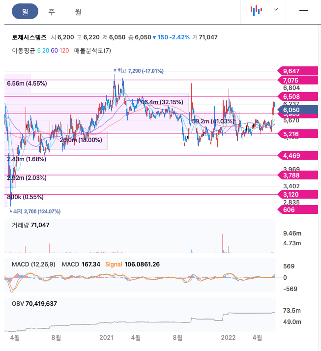 로체시스템즈의 주가는 20년 11월 증가하여 21년 1월 최고 7290원을 찍고 조정을 받은 뒤 반등하고 있습니다.