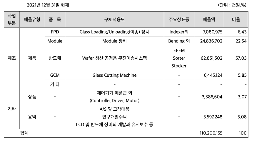 가. FPD 및 반도체 생산장비에 관한 물류제어기술을 이용하여 FPD (Indexer), Wafer Cassette Station(EFEM),디스플레이 Module장비 등을 개발, 생산, 판매하고 있습니다