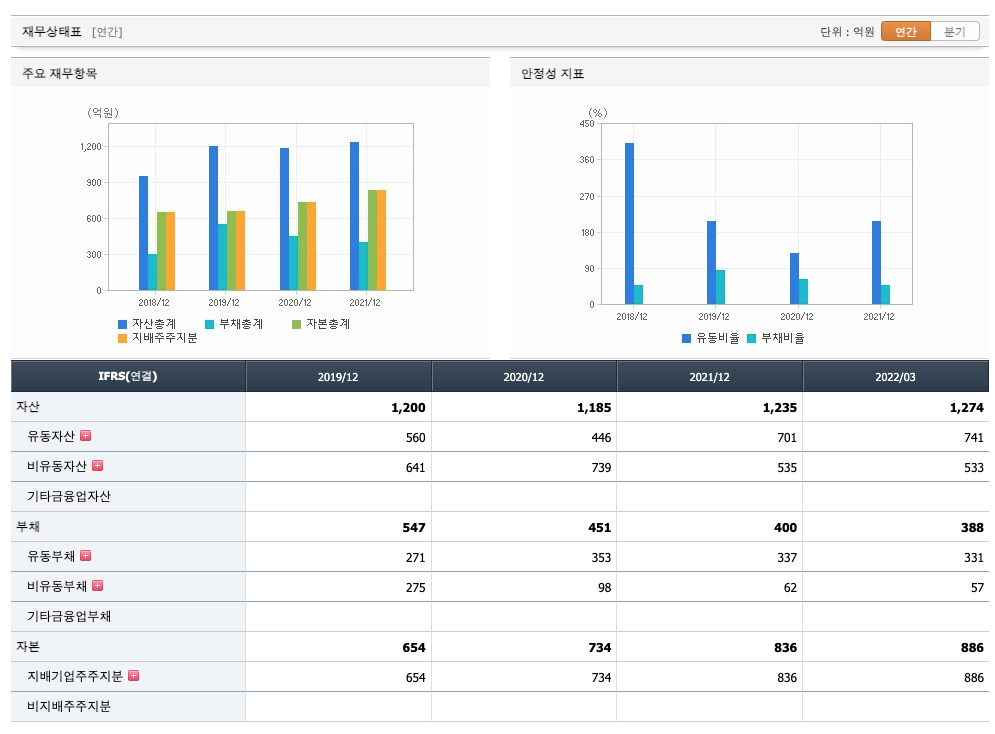 ROE(Return On Equity, 자기자본순이익율, 주주의 관점) : 2018년 약 -2%, 2019년 약 1.84%, 2020년 약 12%, 2021년 약 12%이고, 자기자본순이익율은 이상율(10%)보다 높습니다.