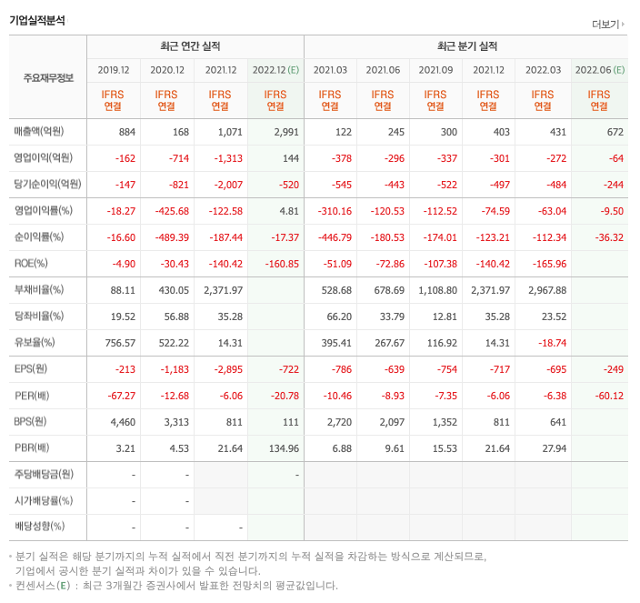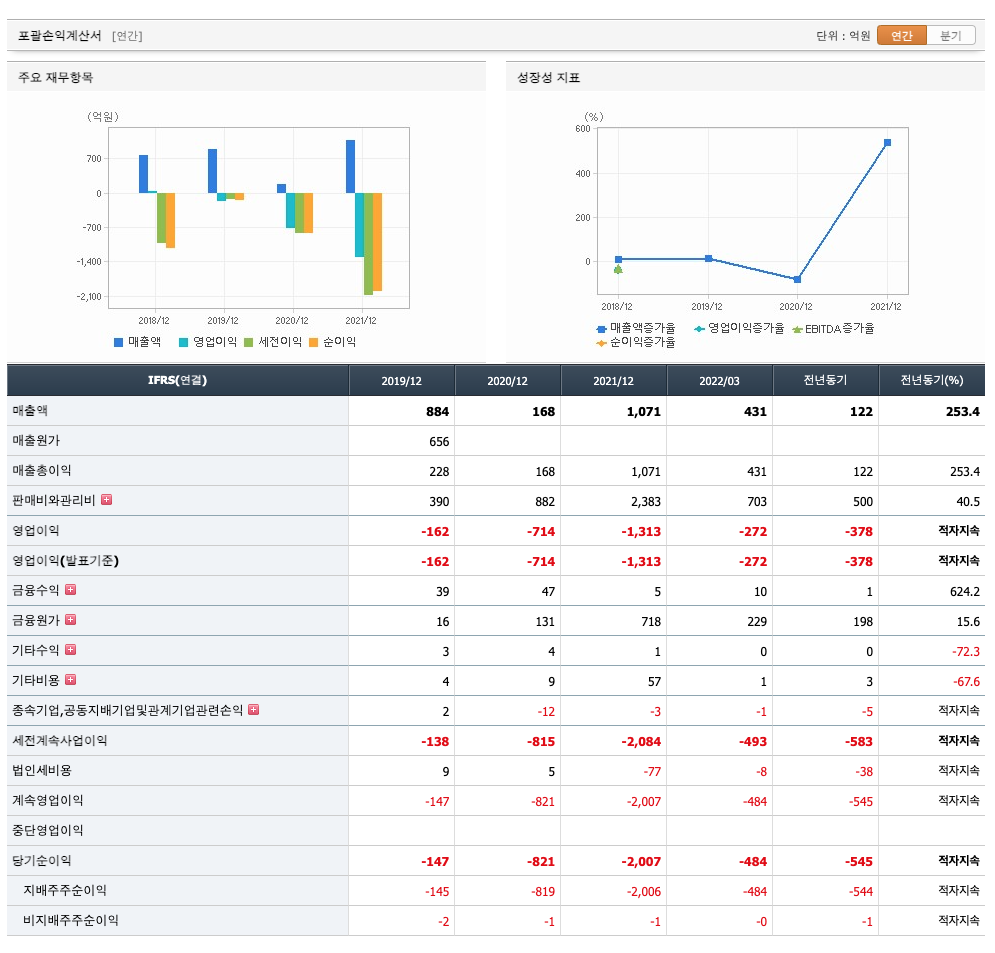 영업이익 : 2018년 -162억원, 2019년 -714억원, 2020년 -1313억원, 2021년 -272억원으로 전년동기대비 적자지속하였습니다. 2021년 분기별로 보면 1분기 -296억원, 2분기 -337억원, 3분기 -301억원, 4분기 -272억원입니다.