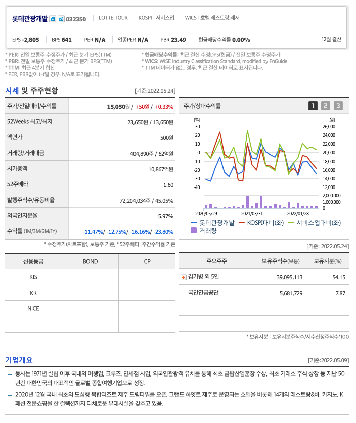 | 롯데관광개발 | 15,050원 | 17,350원 | 17,202원 | 16,996원 |