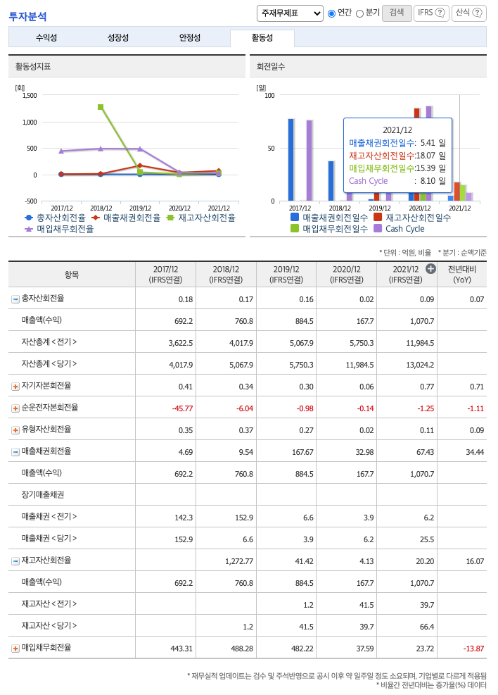 재고자산회전율(높을 수록 좋습니다) : 2019년 약 41억원, 2020년 약 39억원, 2021년 약 66억원이고, 회전율은 2019년 약 41%, 2020년 약 4%, 2021년 약 20%로 안정적입니다.