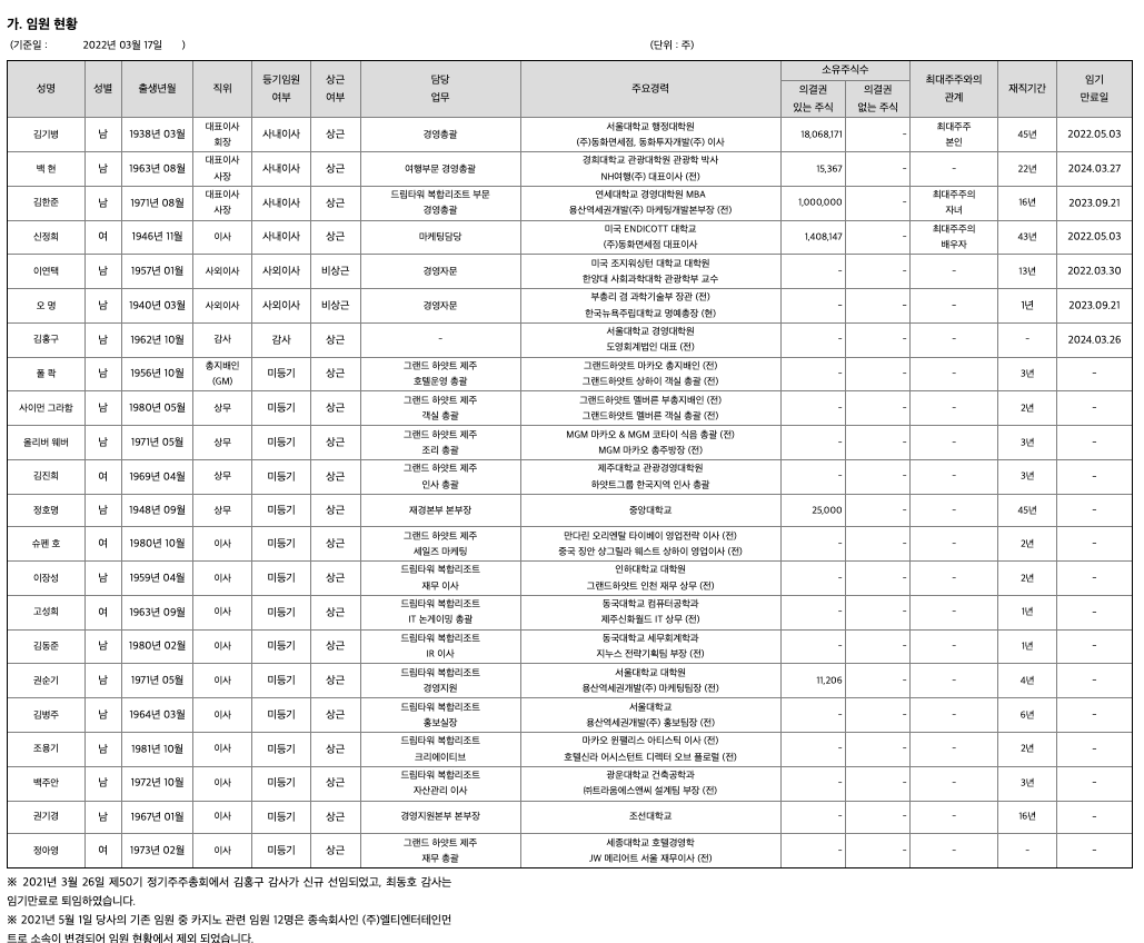 한편, 당사의 종속회사인 (주)엘티엔터테인먼트는 엘티카지노(외국인전용카지노)의 영업장 소재지를 기존 롯데호텔제주에서 제주 드림타워 복합리조트로 이전하고, 영업장 면적을 기존의 1,176㎡에서 5,367㎡로 확장하기 위하여 2021년 1월 29일 '엘티카지노의 영업장 소재지 및 면적 변경 허가'를 제주특별자치도에 신청하였으며, 2021년 4월 8일 변경 허가를 득하였습니다. 이에 따라 엘티카지노를 제주 드림타워 복합리조트로 확장 이전하여 2021년 6월 11일 개장하였습니다. 참고로 당사는 2014년 정관 개정을 통해 카지노업을 사업목적으로 추가하였으며, 2018년 8월 17일 파라다이스그룹이 제주 롯데호텔에서 운영중이던 '파라다이스 제주롯데 카지노(주식회사 두성)'를 주식양수도계약을 통해 149억원에 인수한 후, 상호를 '엘티카지노(주식회사 엘티엔터테인먼트)' 로 변경하고 350억원 유상증자에 참여하여 엘티카지노의 재무구조를 개선함으로써 카지노사업 진출의 기반을 마련하였습니다. (종속회사 (주)엘티엔터테인먼트에 대한 내용은 XII. 상세표를 참고해주십시오.)