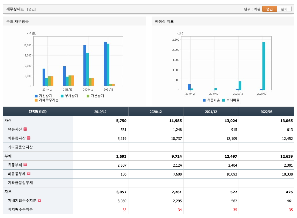 부채비율 : 2019년 약 88%, 2020년 약 430%, 2021년 약 2371%로 감소하고 있으며, 표준(100%)보다 높아 부채비율이 안정적이지 않습니다.