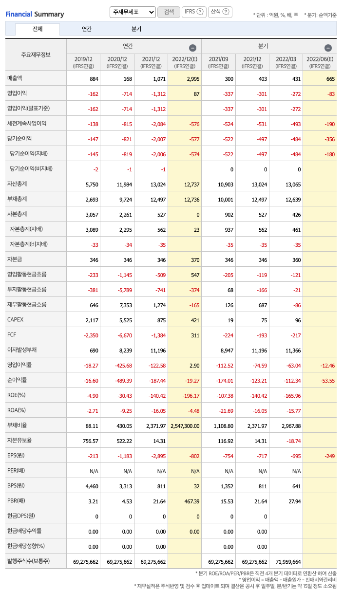 FCF(미래현금흐름) : 2019년 -2350억원, 2020년 -6670억원, 2021년 -1384억원으로 CAPEX가 좋지 않습니다. 2022년은 311억원으로 추정됩니다.