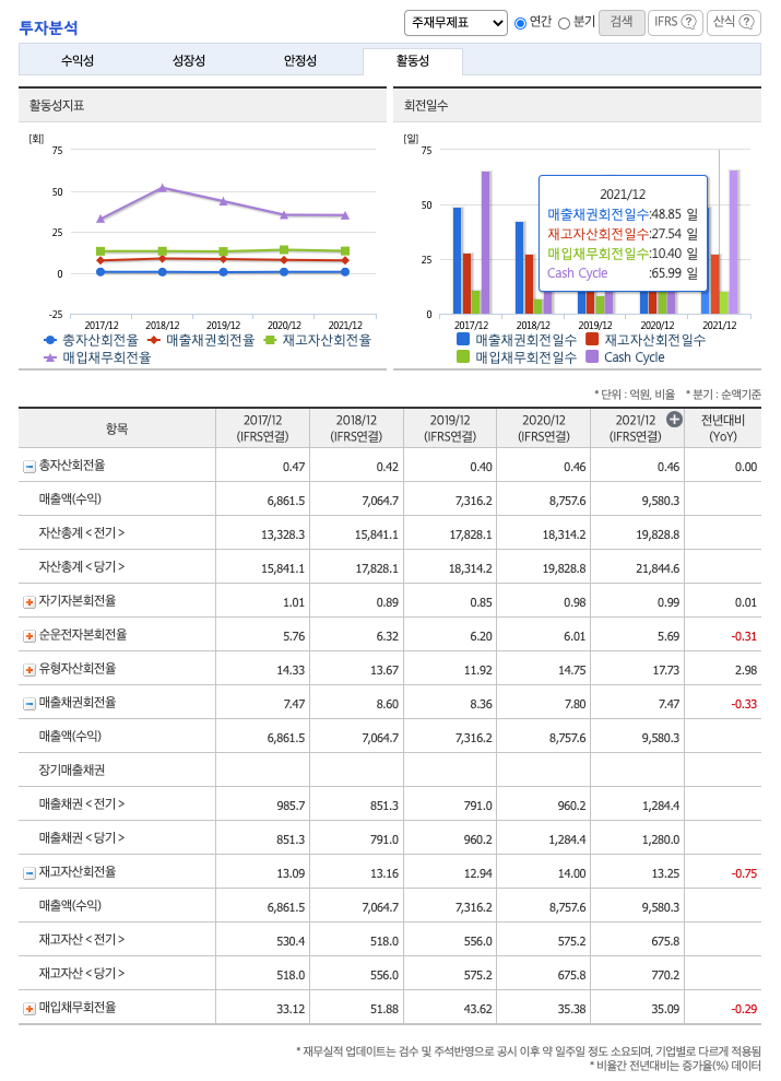 재고자산회전율(높을 수록 좋습니다) : 2019년 약 575억원, 2020년 약 675억원, 2021년 약 770억원이고, 회전율은 2019년 약 12%, 2020년 약 14%, 2021년 약 13%로 안정적입니다.