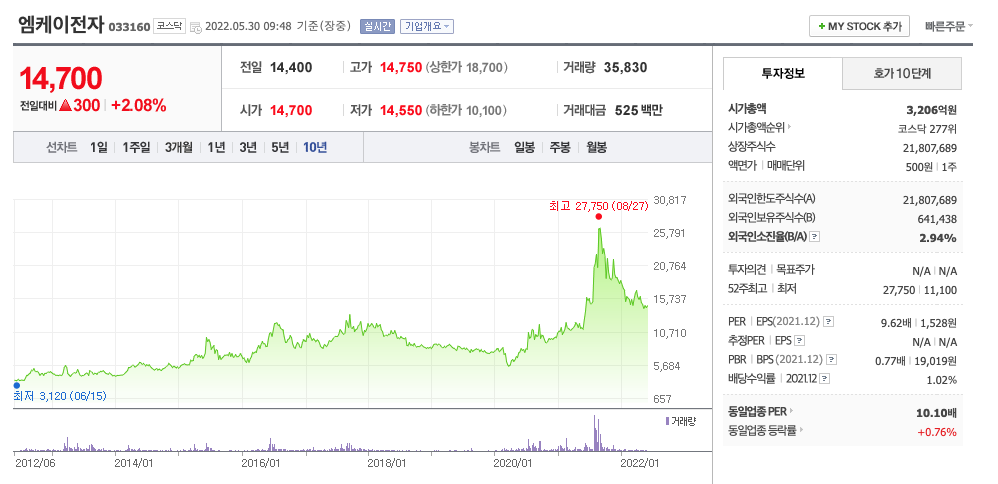 | 엠케이전자 | 14650원 | 15,544원 | 15,393원 | 16,076원 |