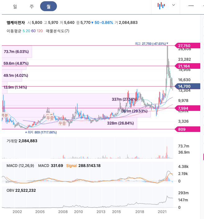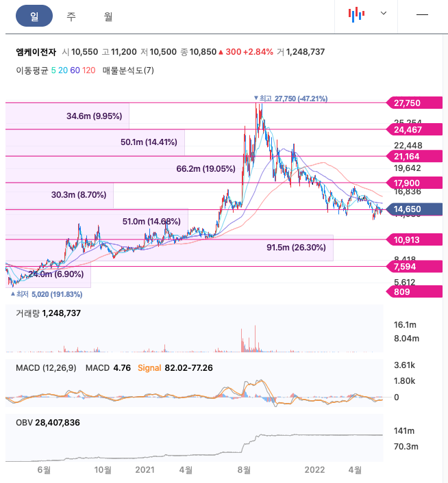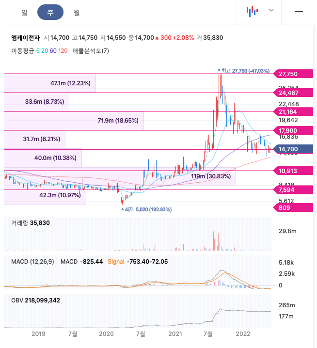 엠케이전자의 주가는 21년 6월 급등하여 21년 9월 최고 27,750원을 찍고 조정을 받았습니다.