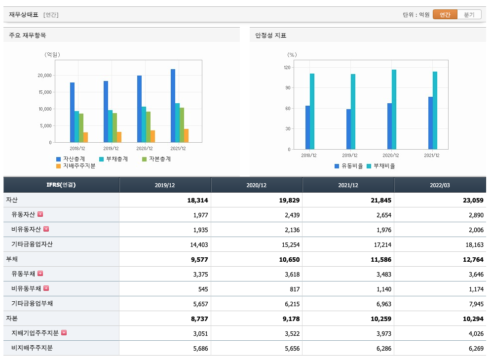 자산은 2019년 18,314억원, 2020년 19,829억원, 2021년 21,845억원, 2022년 1분기 23,059억원으로 증가하였습니다.