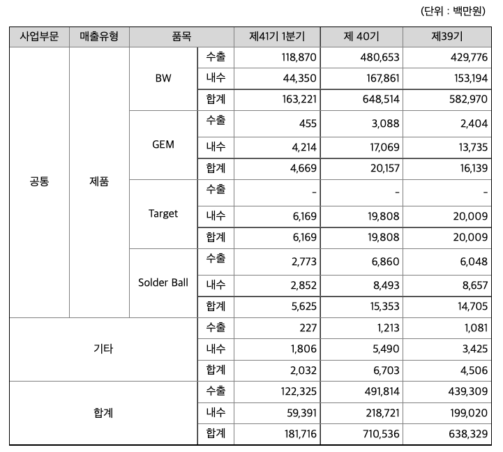 당사의 주력 제품인 본딩와이어(Bonding Wire)는 머리카락 평균 굵기의 1/10정도 되는 미세 금속선으로 반도체 리드 프레임과 실리콘 칩을 연결하여 전기적 신호를 전달하는 부품 입니다. 과거 금이 주원료였던 본딩와이어 산업은 비용 절감 노력과 기술 혁신으로 인해 현재약 50~60% 구리, 은 소재의 와이어로 대체되었으며 중국 반도체시장이 성장함에 따라 전체 본딩와이어 시장의 40%에 달하는 수요가 중국 내수에서 발생하고 있습니다.