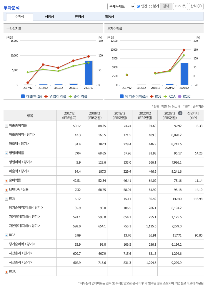 ROA(Return On Assets, 총자산순이익율, 경영자의 관점) : 2017년 약 5%, 2019년 약 13%, 2020년 약 26%, 2021년 약 117%이고, 자기자본순이익율은 이상율(10%)보다 높습니다.